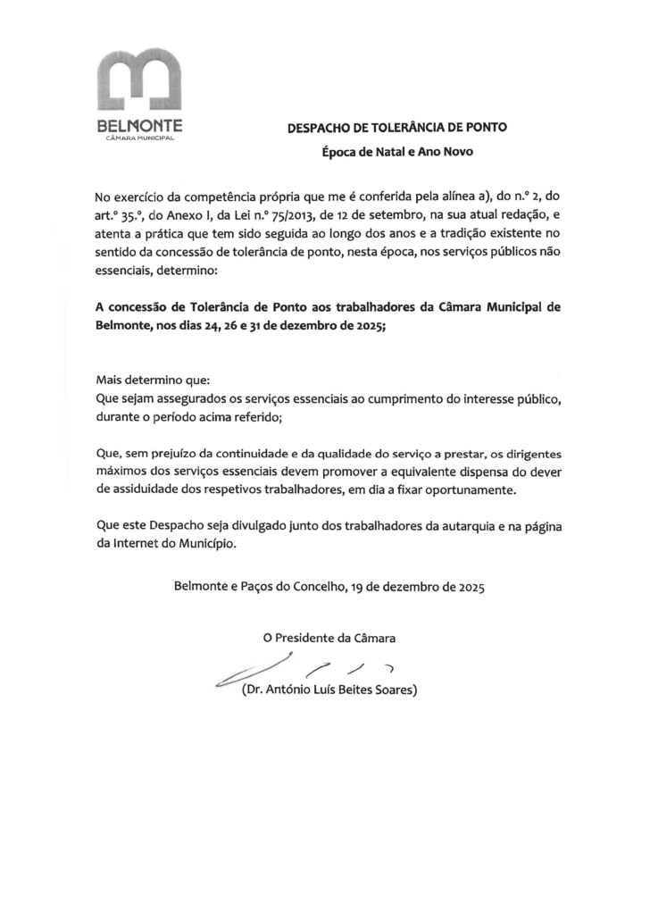 A concessão de Tolerância de Ponto aos trabalhadores da Câmara Municipal de Belmonte, nos dias 24, 26 e 31 de dezembro de 2025;